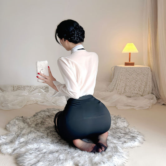 欲擒故纵-性感两穿-黑【网纱长袖罩衣+开裆连体衣+腿环】C368
