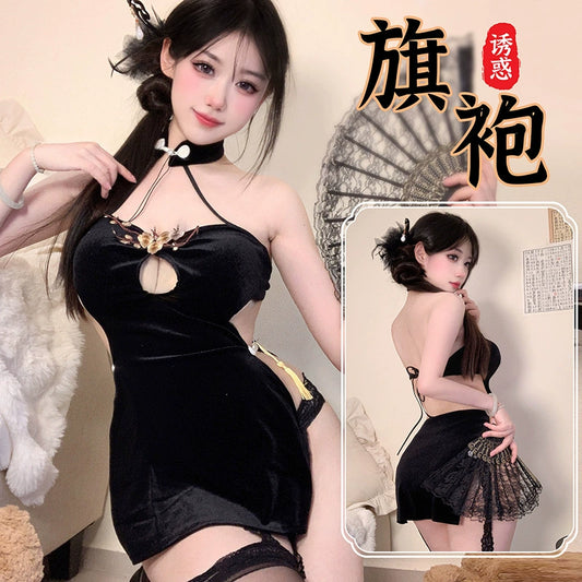倾君一心-闪亮链条挂脖立领镂空旗袍 C338